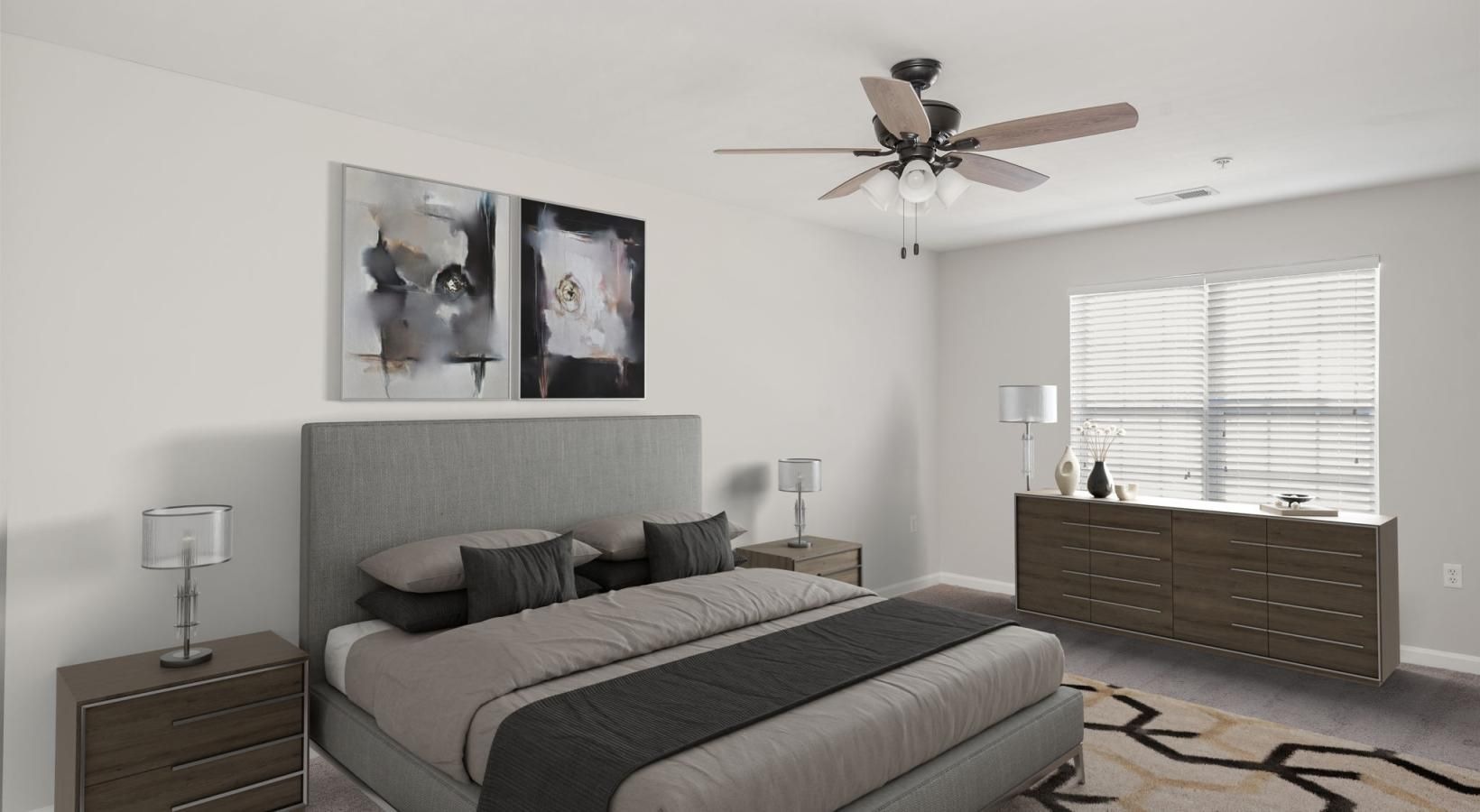 • a bedroom with a bed and a fan