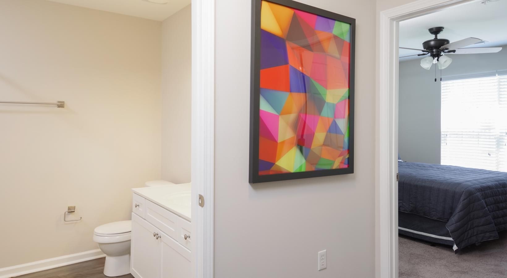 • a bedroom with a painting on the wall