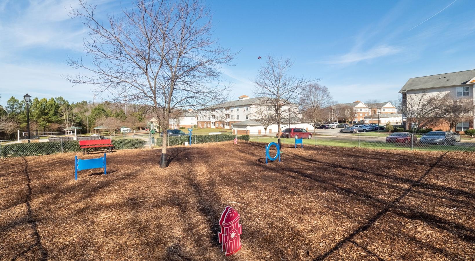 • a dog park with trees and houses in the background