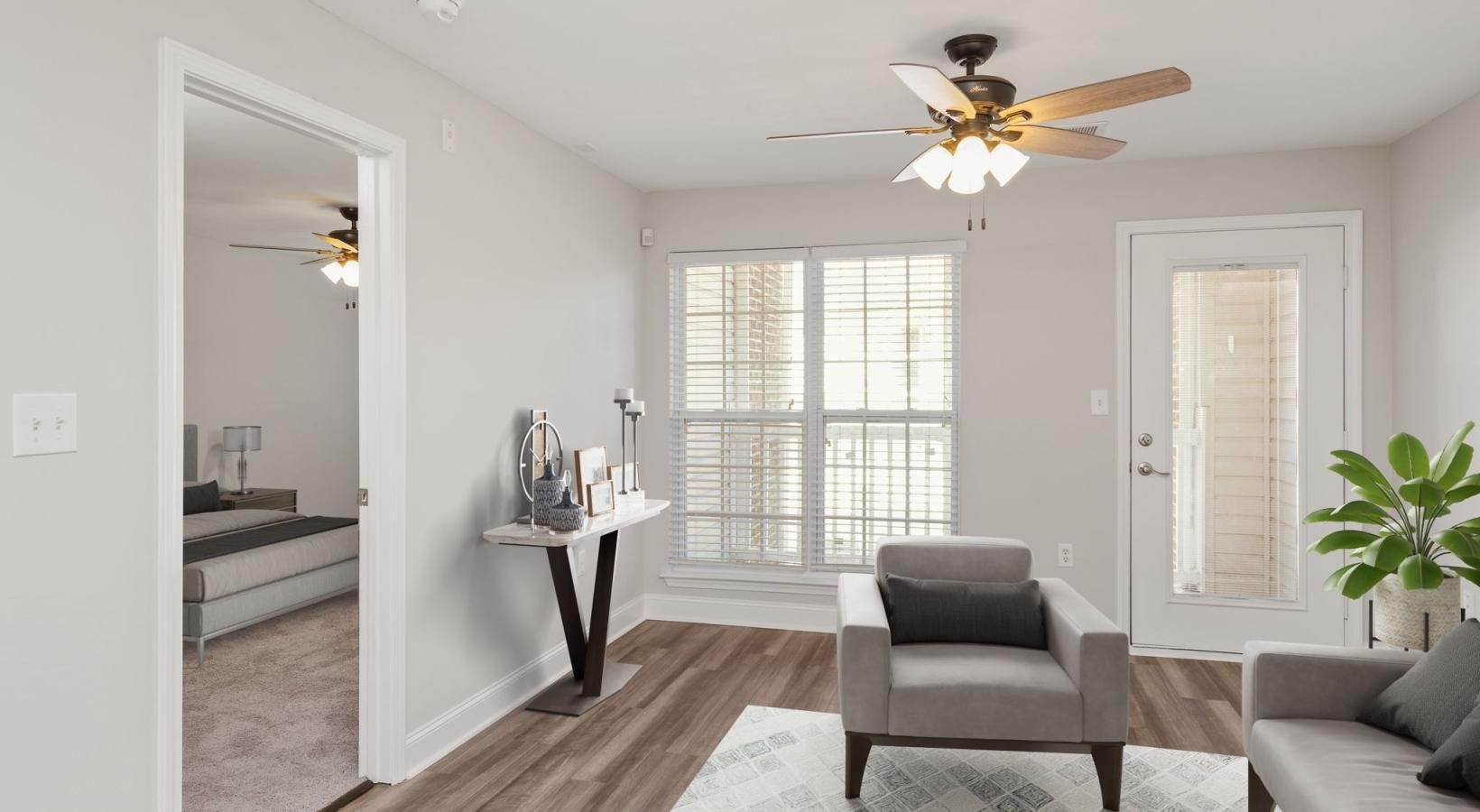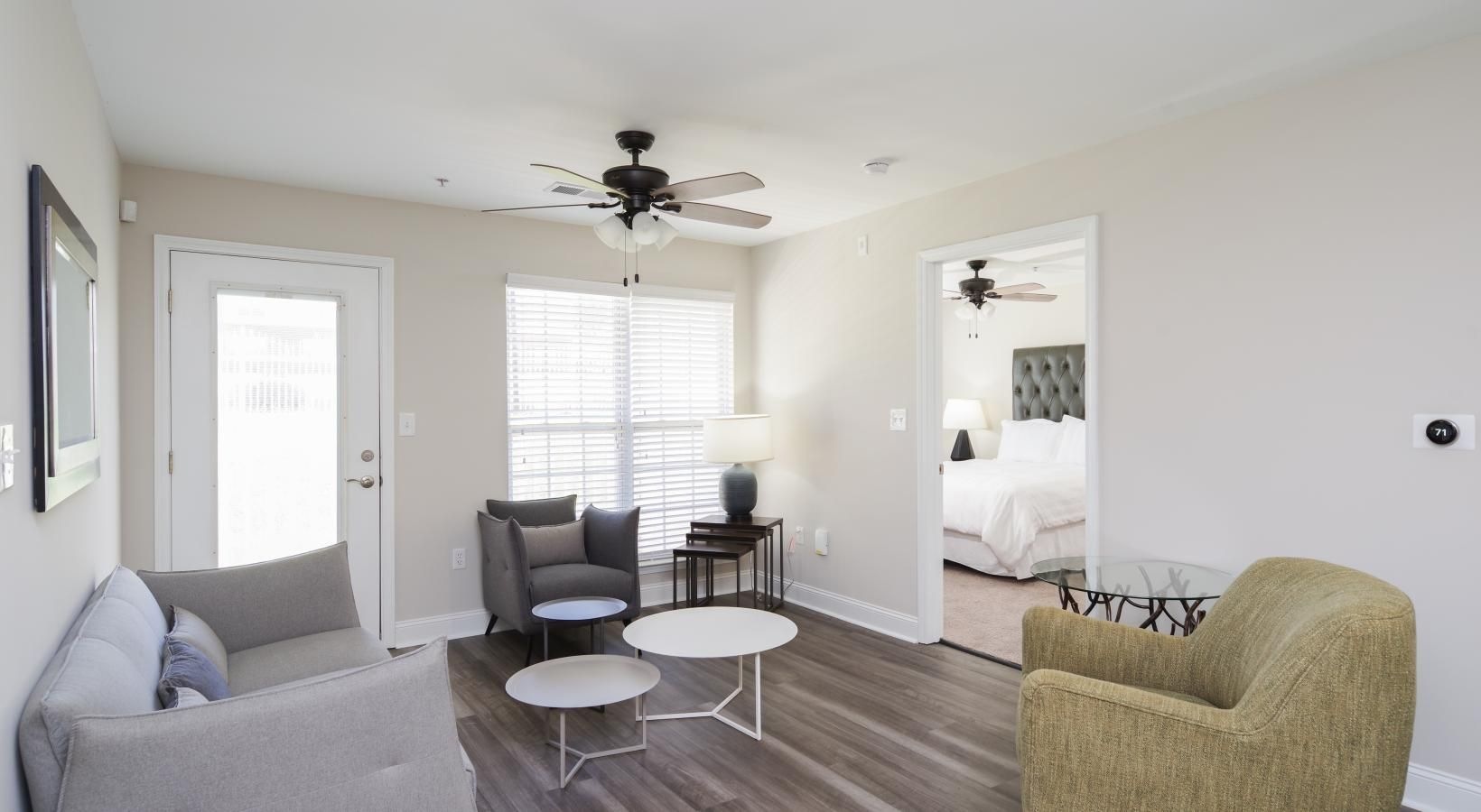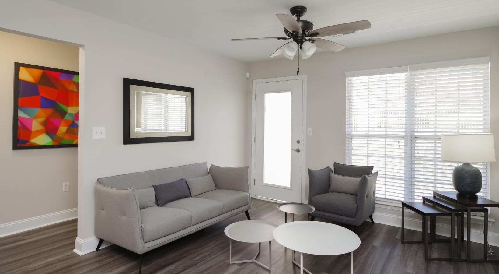 • a living room with a ceiling fan