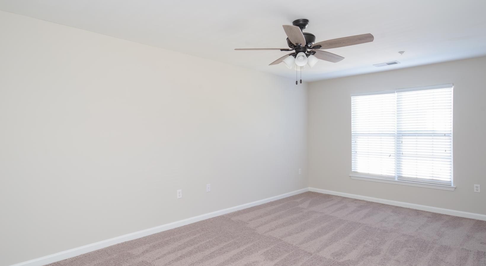 • a room with a wood floor and a ceiling fan