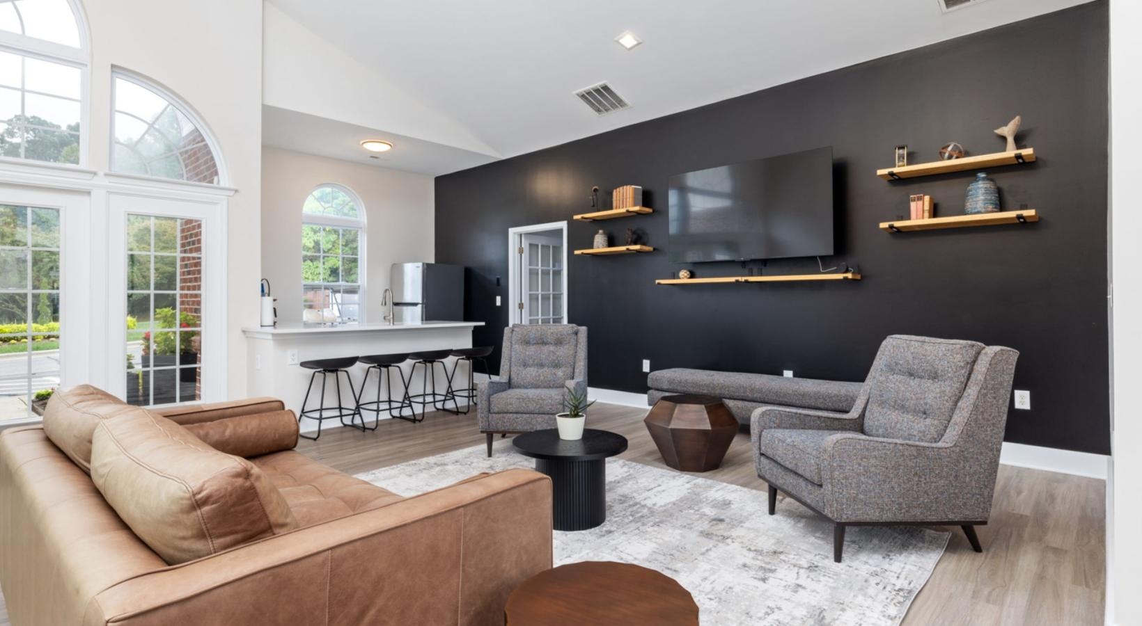 • a lounge with a large tv and seating