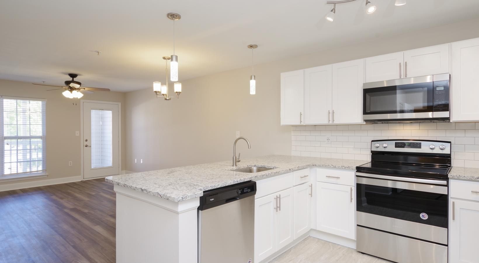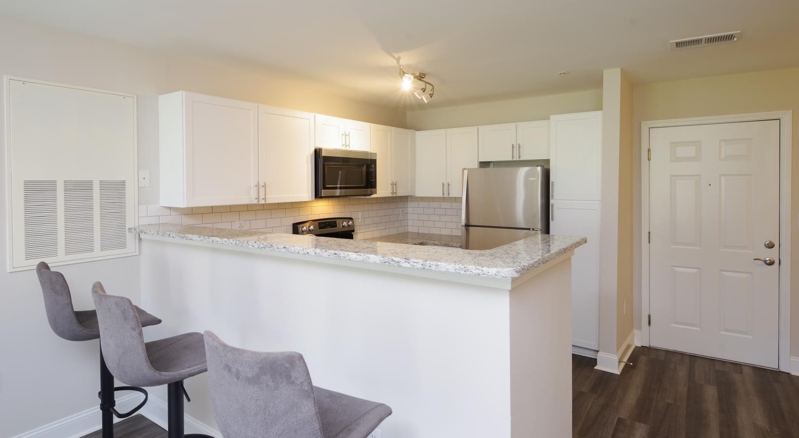 • a kitchen with white cabinets