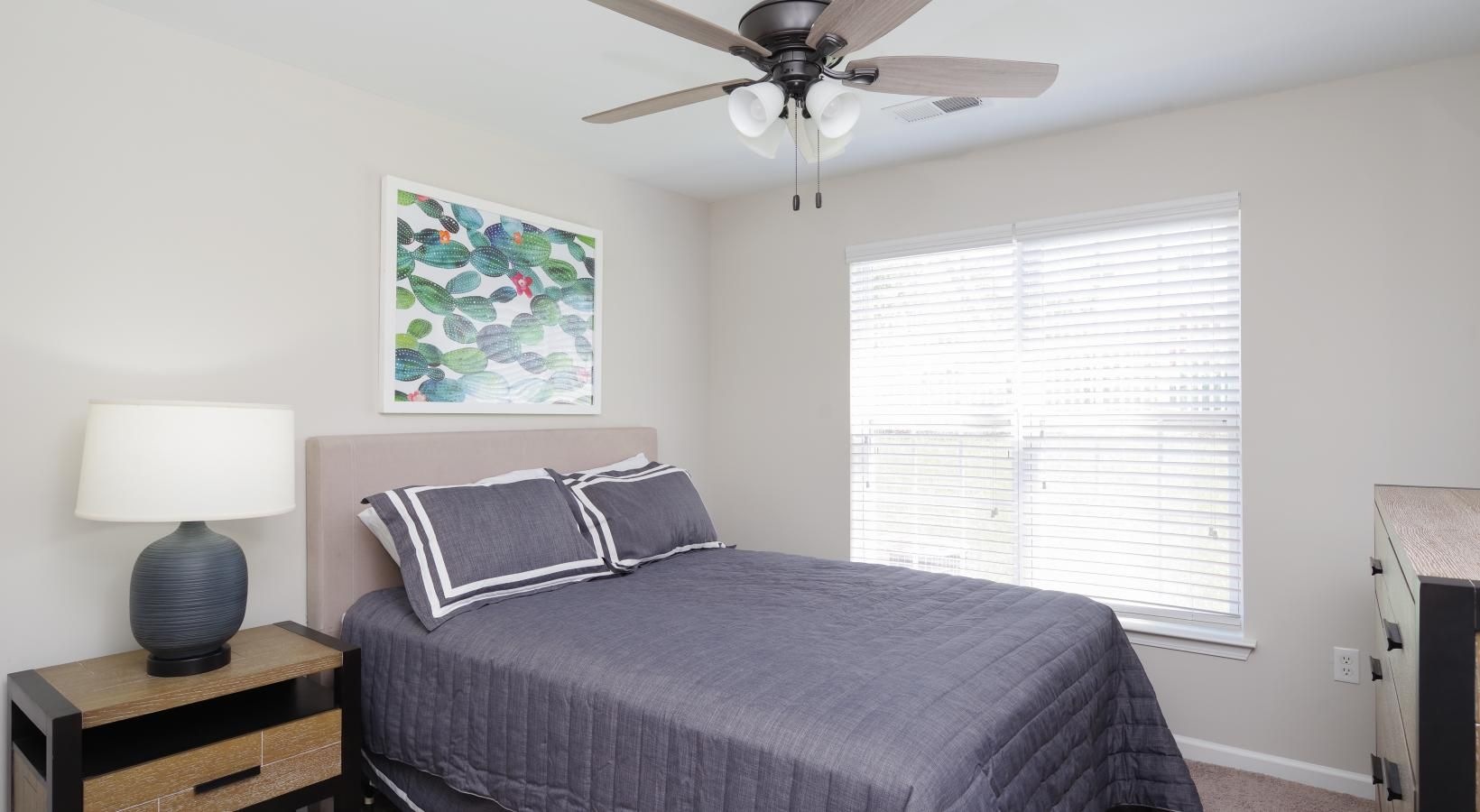 • bedroom with a bed fan side table and lamp