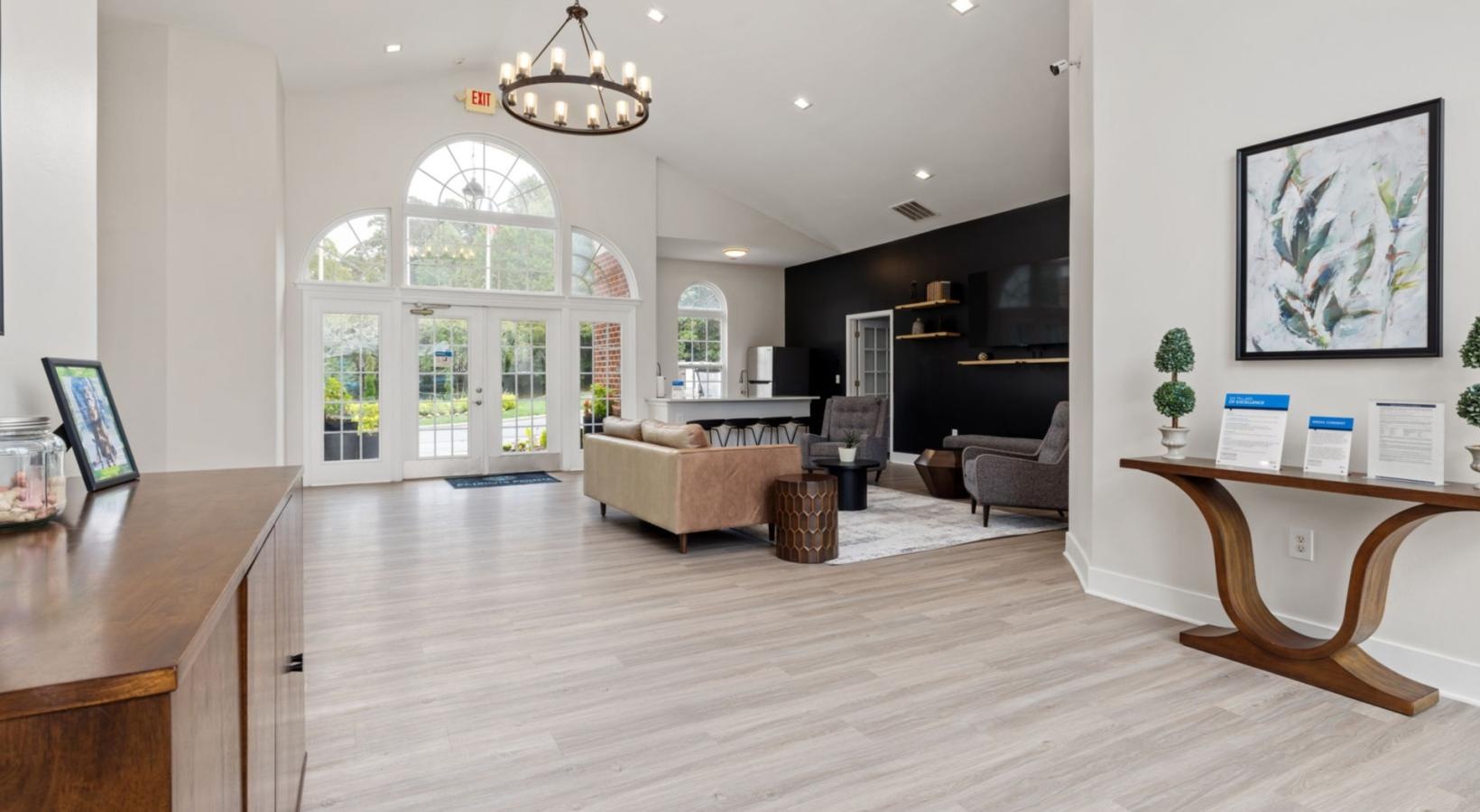 • a large living room with a large chandelier and a wood floor