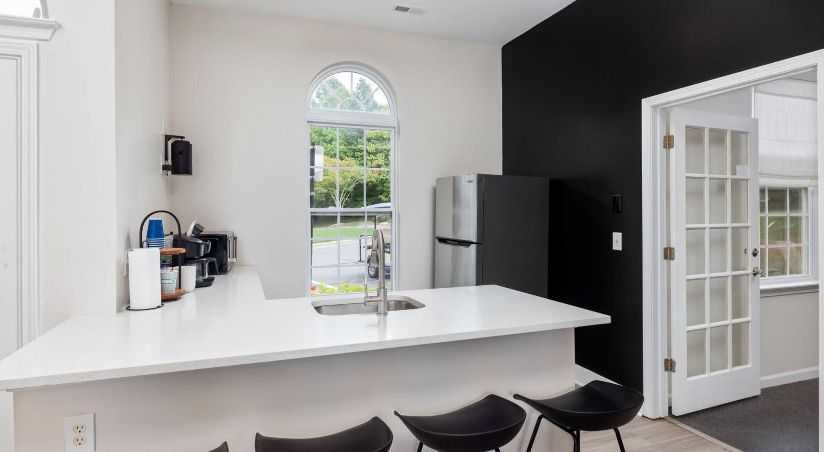 • a kitchen with a sink and barstools