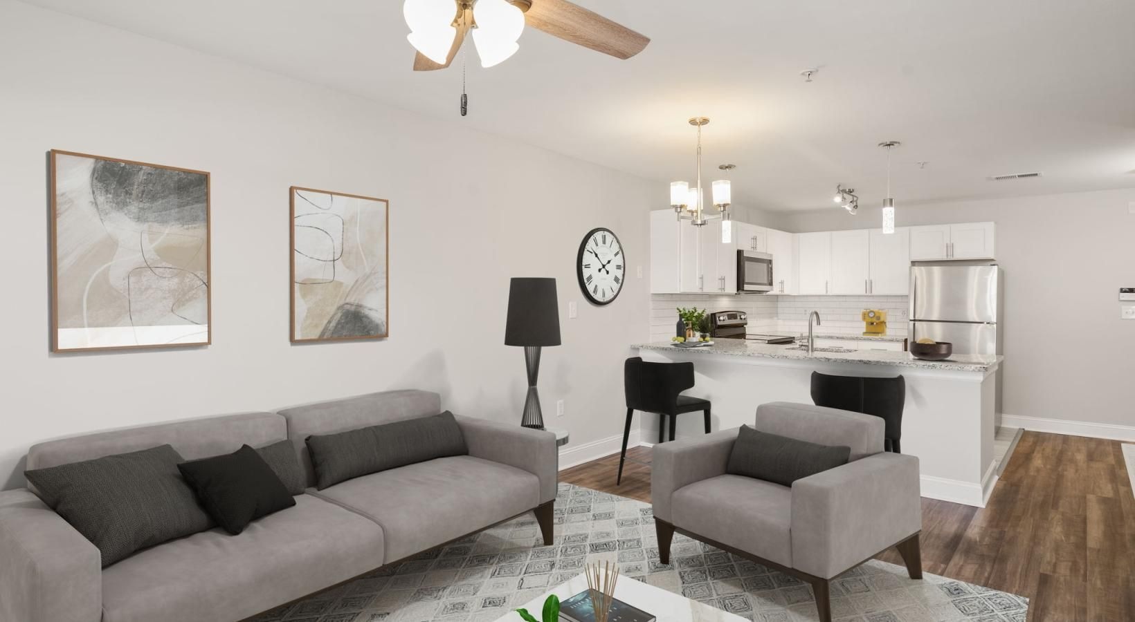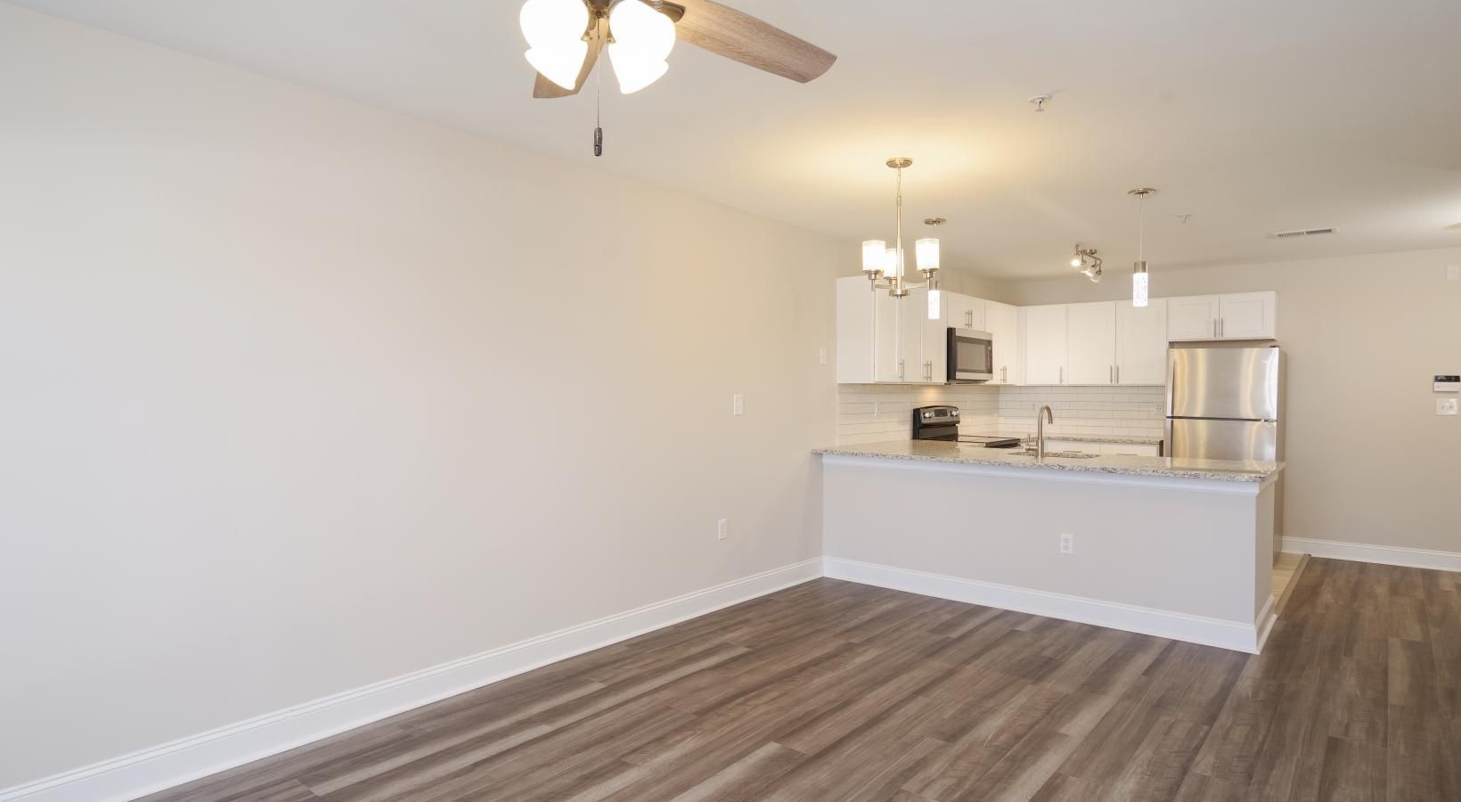 • a kitchen and living room with a ceiling fan and wood floors