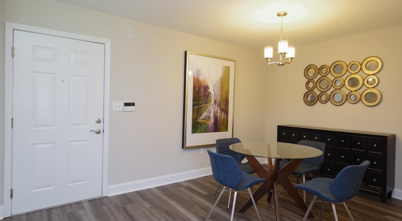 • a room with a table chairs and a painting on the wall
